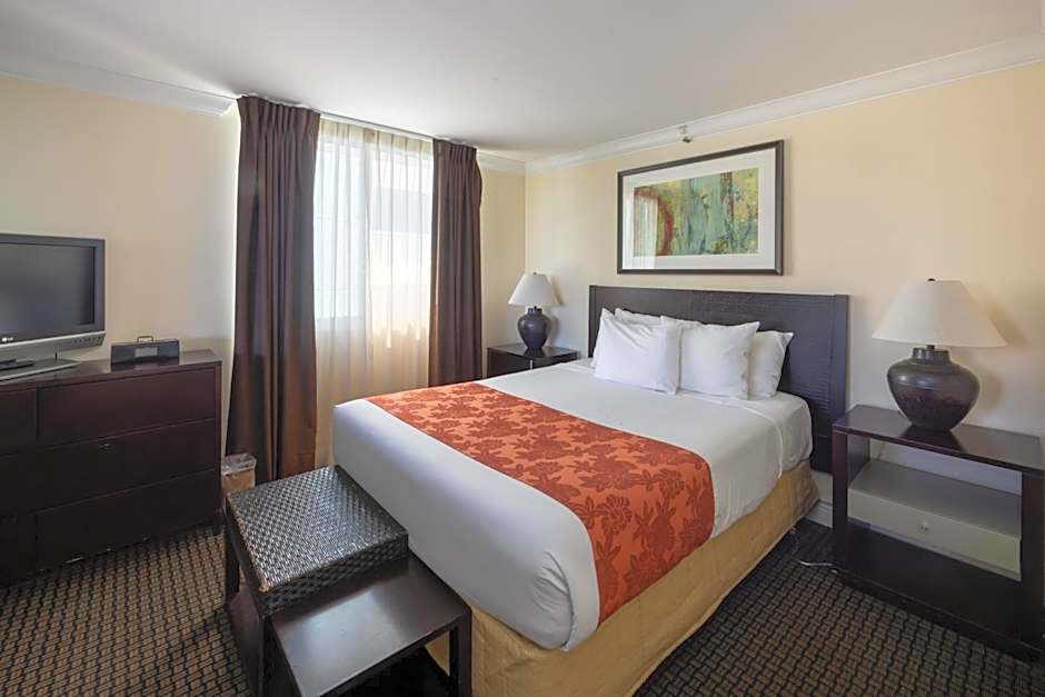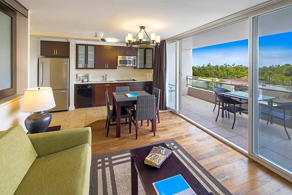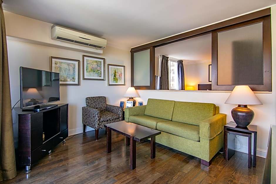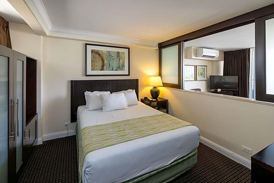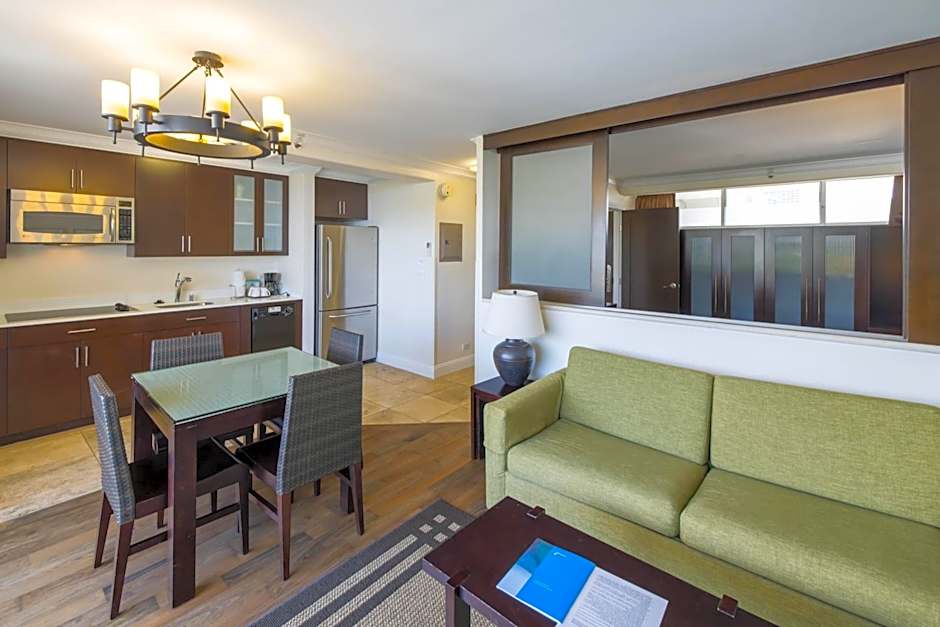 A charming one-bedroom retreat offers the comforts of home and is just a short stroll from Waikiki Beach. Ideal for up to four guests, it features a queen bed in the bedroom and a cozy sofa bed in the living room. • Kitchen includes ceramic stove top, microwave, dishwasher, refrigerator, coffeemaker, toaster, cookware and tableware • Welcome essentials kit includes coffee, tea, sugar, creamer, dish soap, sponge, paper towels, dishwasher detergent & laundry detergent • Floor to ceiling windows for ample natural light • Bedroom with 1 queen bed • Subway tiled walk-in shower and granite counter with vessel sink • Bath amenities include shampoo/conditioner, soap & hair dryer • Full size sofa bed in living area • Dining area with seats for 4 • Air conditioning & ceiling fan in kitchen • Drapes for privacy • TV with standard cable in living room and bedroom • Wi-Fi • In-room safe • Iron and board • Smoke detectors and fire sprinklers • Balcony with outdoor furniture • Children 17 years and under are free when sharing room with parent(s) utilizing existing beds Each unit has its own unique décor and furniture